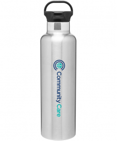 24 oz powder coated double wall 18/8 stainless steel thermal bottle with copper vacuum insulation, threaded gear-shaped insulated lid and carrying handle Complies with FDA, Prop 65. 11.25" H x 3" W