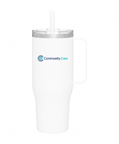 40 oz double wall 18/8 stainless steel thermal mug with copper vacuum insulation, stainless steel rim, dual-purpose push-on clear lid, matching sliding closure, flexible wide silicone straw, and powder coated finish. Individual gift box. Hand wash recommended. Do not microwave. Complies with FDA, Prop 65. 9.75" H x 4" W