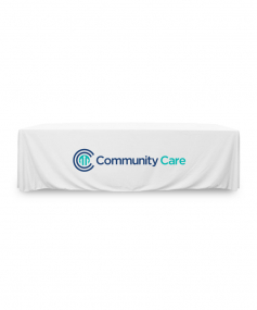 8 ft. Premium PolyKnit throw table cover with one color logo. Fits a 96 inch wide x 30 inch deep table. All corners are rounded meaning they will not gather and lay on the floor. Floor length on 4 sides. This cloth requires no ironing, is EasyCare machine washable and dryer safe.