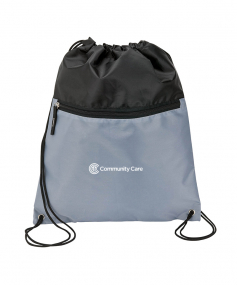 Sport bag with a contrast color front-zippered pocket, reinforced corners and a drawstring closure. Drawstrings double as backpack straps. 12 1/2" W x 15 1/2" H x 3/16" D.