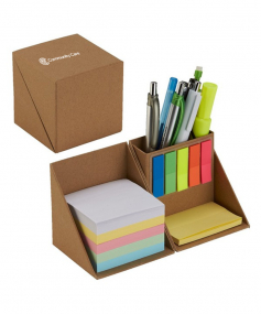 Features 5 colorful sticky flags for page marking, 1 pad of yellow (2" x 3") sticky notes and 5 colors of (3" x 3") note pad cube. Cube made from cardboard. 3 1/2" H x 3 1/2" W x 3 1/2" D